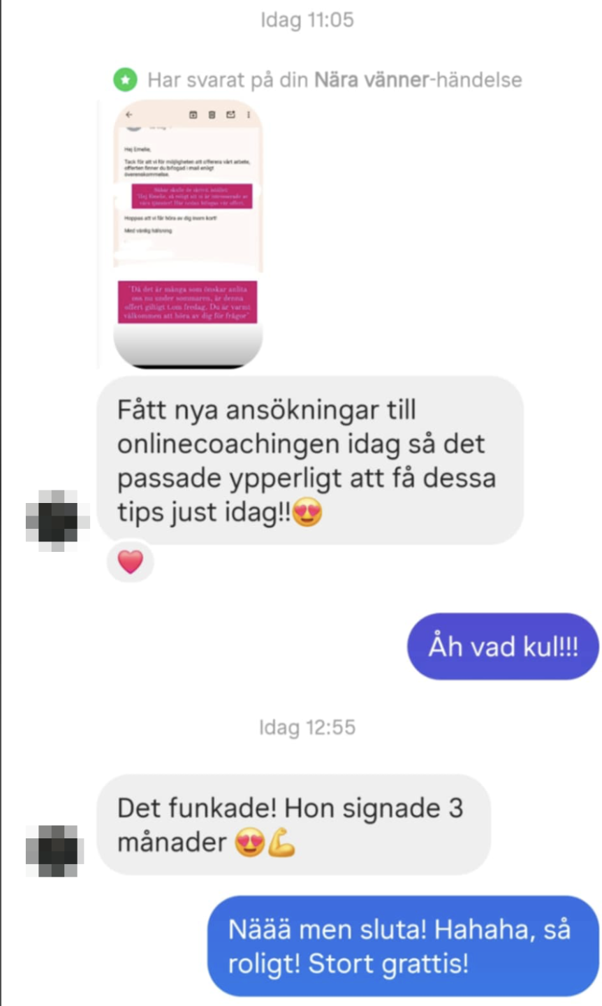 "Jag var så rädd när jag gjorde investeringen, inte för att jag tvivlade på Emelie, men jag tvivlade på mig själv om jag skulle kunna slutföra det. Men det blev den bästa investeringen jag gjort, både i mig själv och för mitt företag! Jag började jobba 100% med bara mitt företag då hälften av min inkomst kom från min webbkurs!"