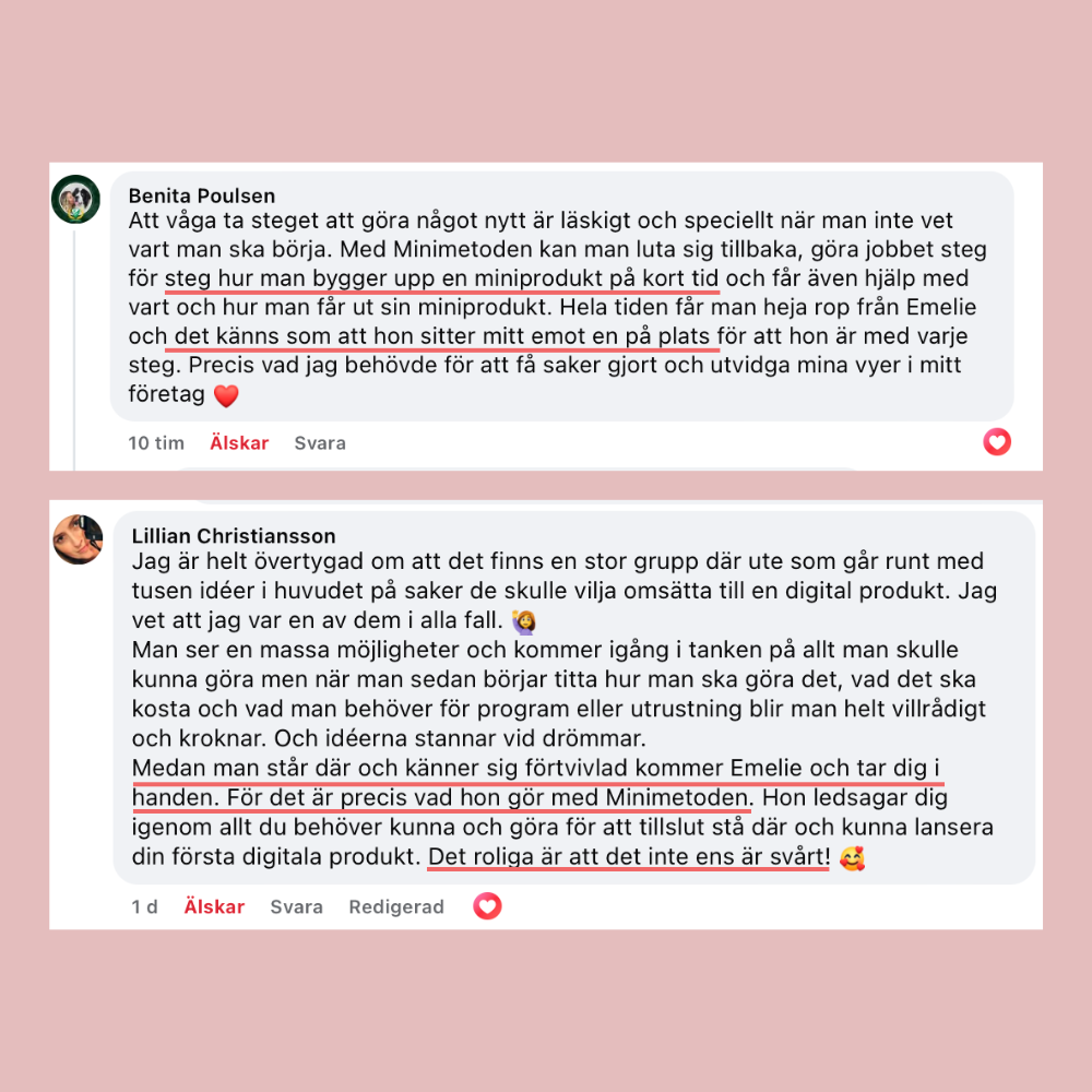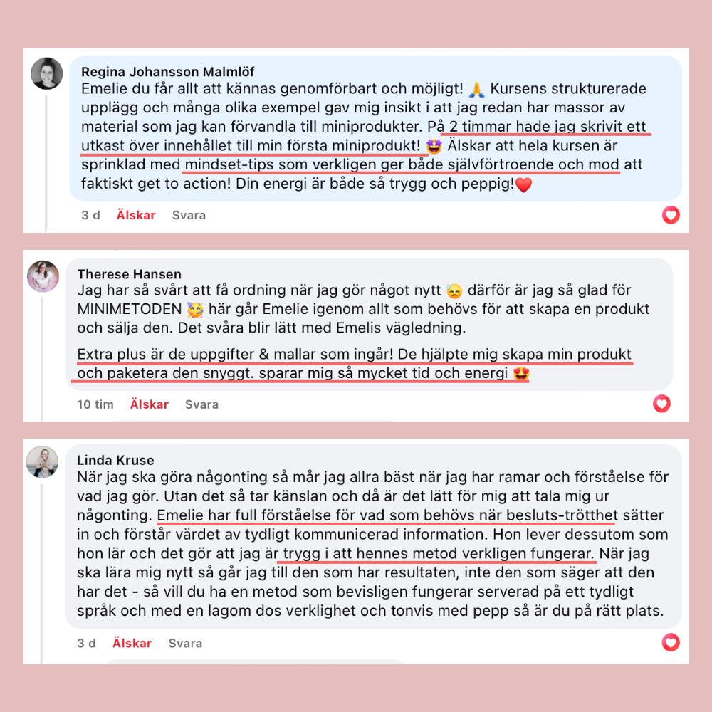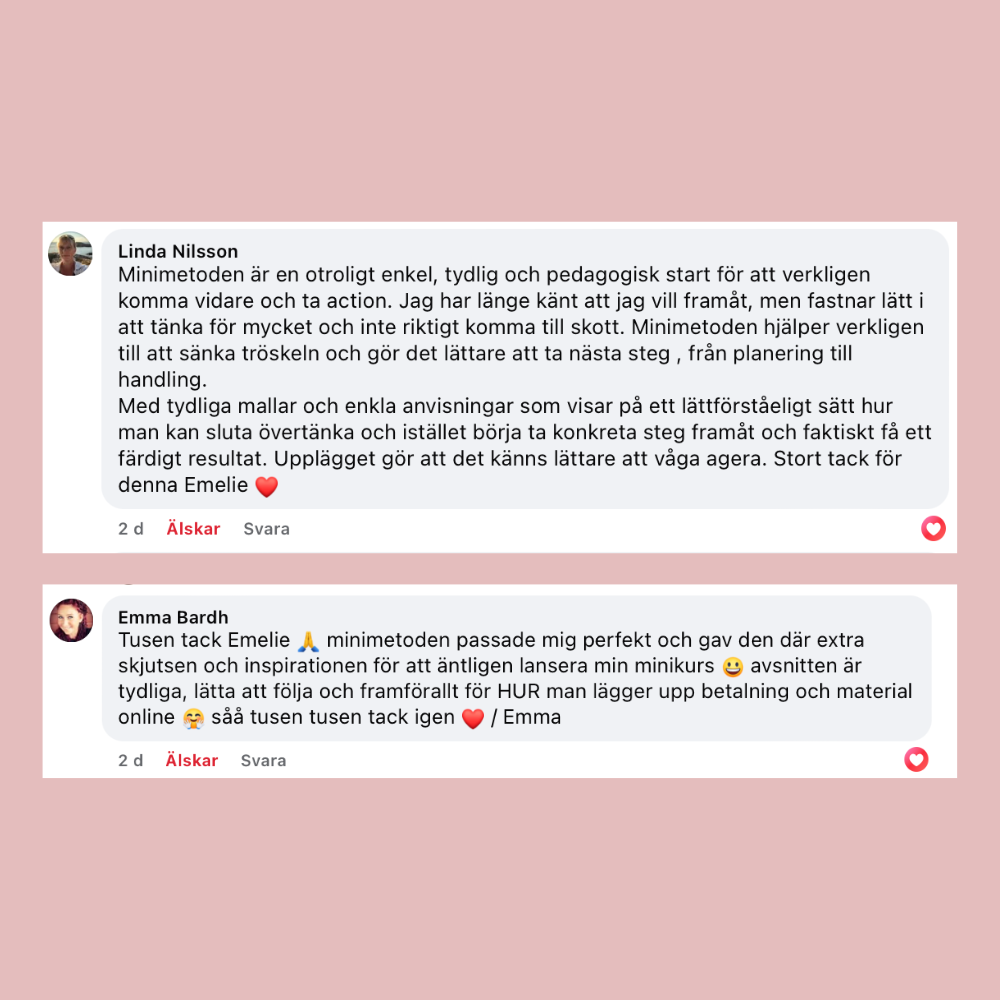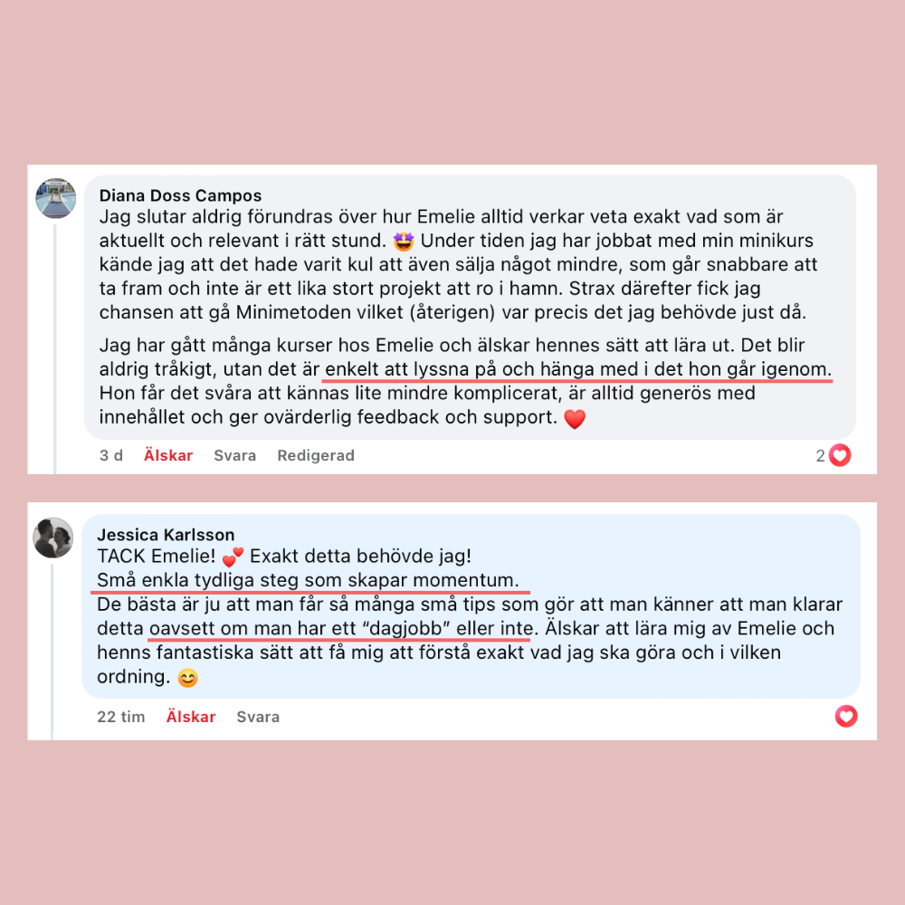 "Jag var så rädd när jag gjorde investeringen, inte för att jag tvivlade på Emelie, men jag tvivlade på mig själv om jag skulle kunna slutföra det. Men det blev den bästa investeringen jag gjort, både i mig själv och för mitt företag! Jag började jobba 100% med bara mitt företag då hälften av min inkomst kom från min webbkurs!"